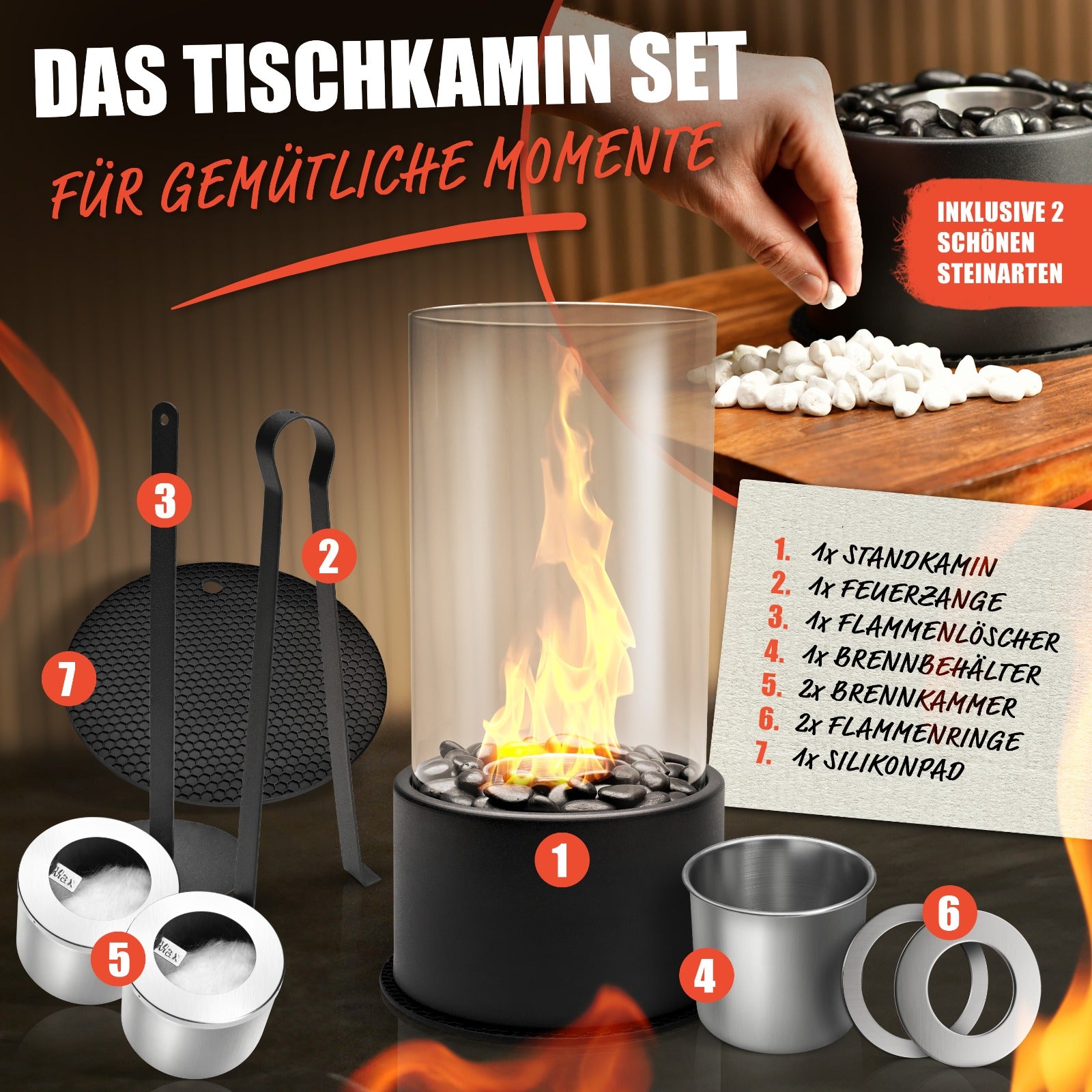 Tischkamin mit durch Ring verstellbare Flamme - mit zwei Steinarten